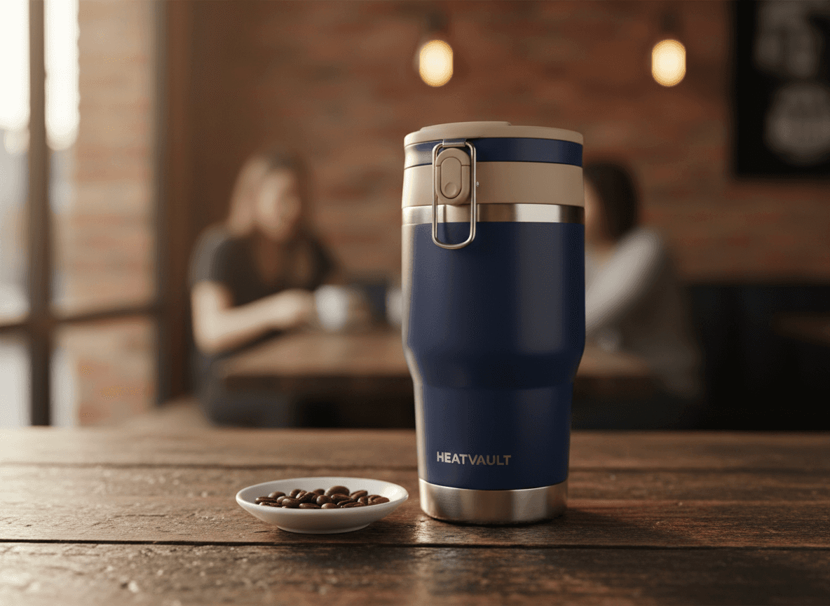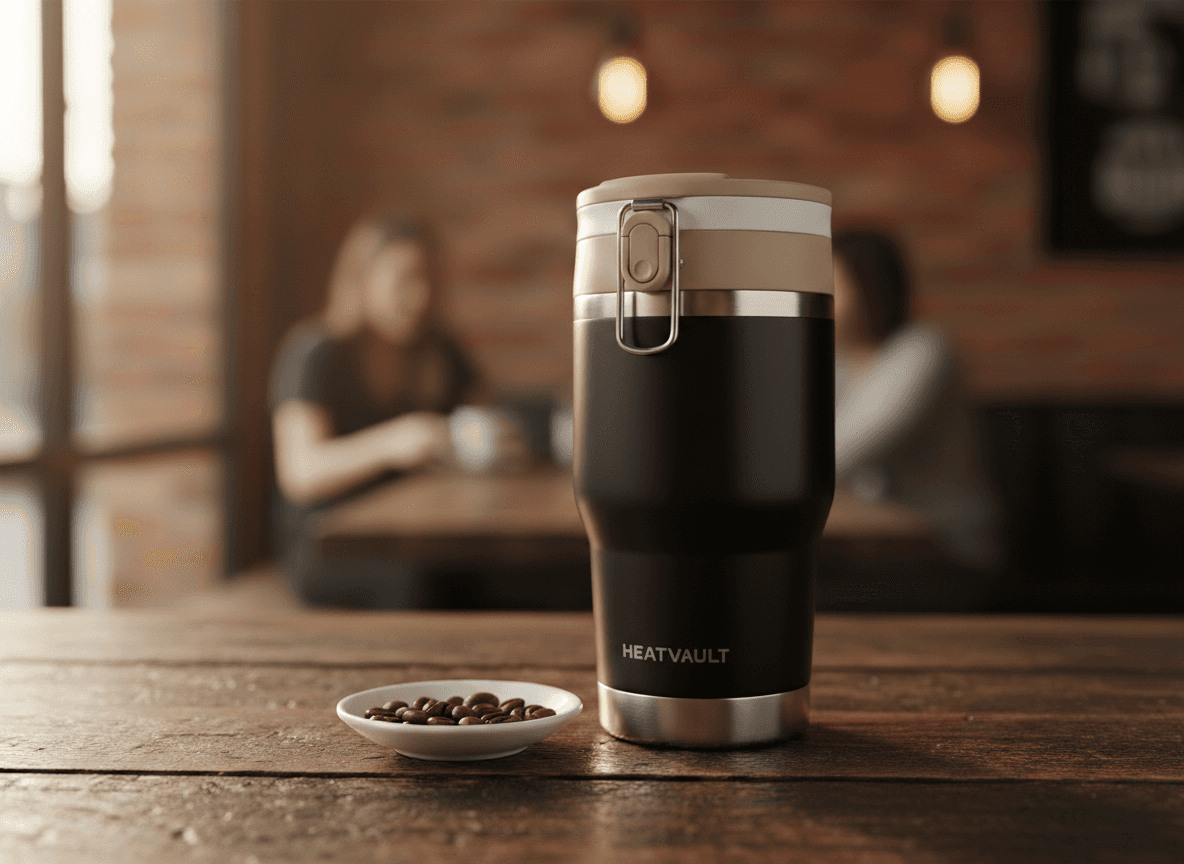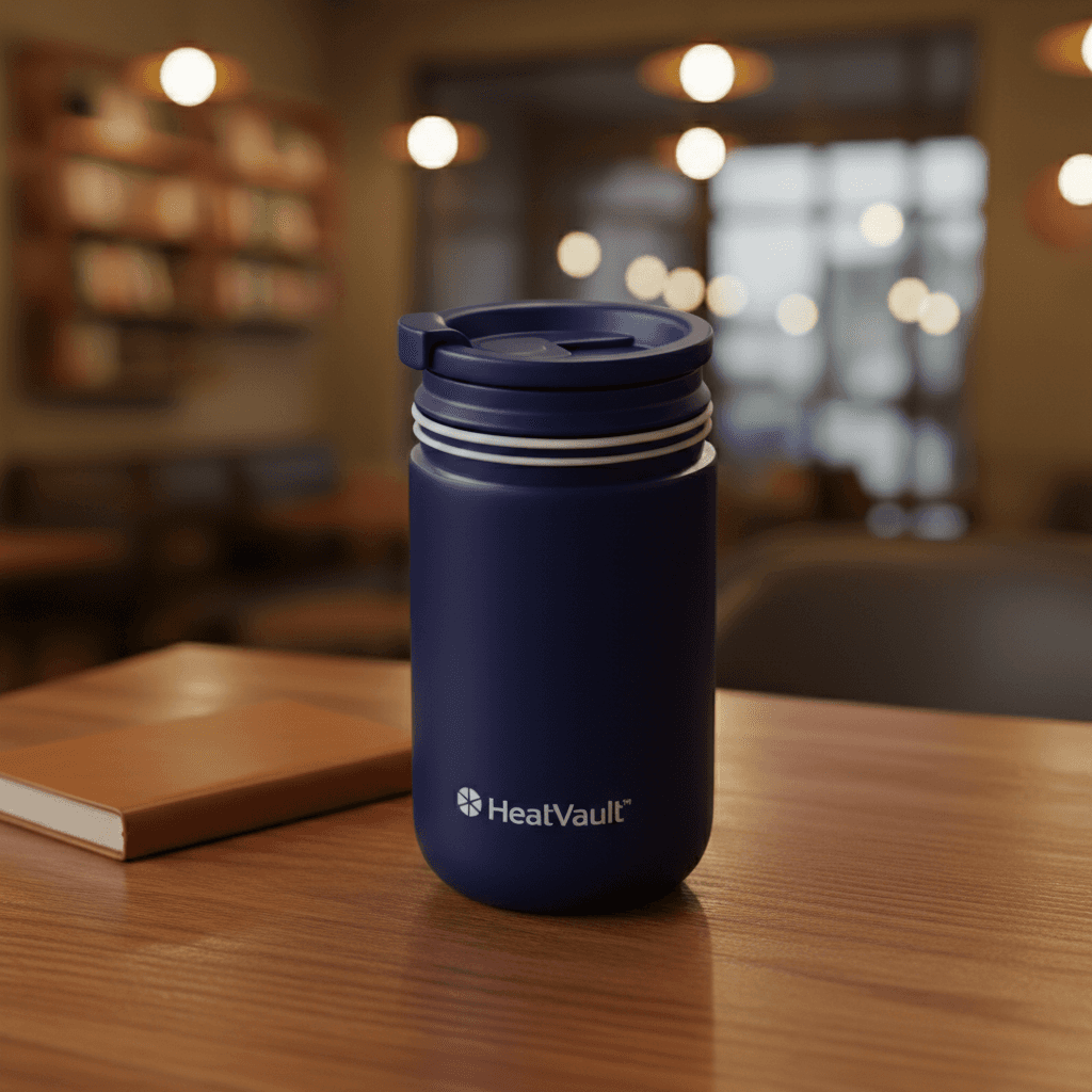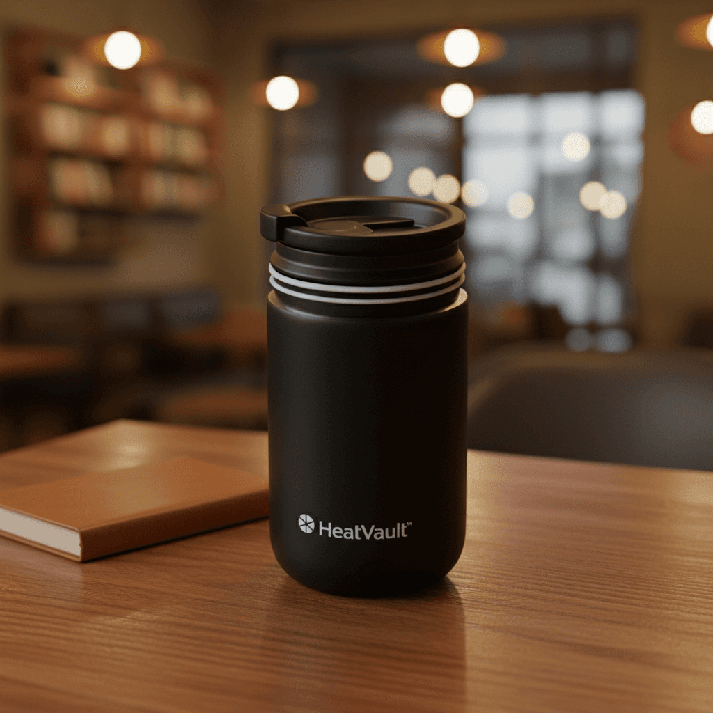 VaultCup — a thermal mug engineered to keep coffee hot all morning. No electronics. Pure thermal science.